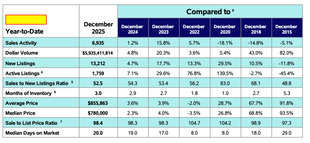 Prices remained relatively stable in December. The average residential sale price was $658,943, essentially unchanged from December 2024. This follows November’s modest year-over-year increase and reflects a market where prices are being supported, but not driven higher.