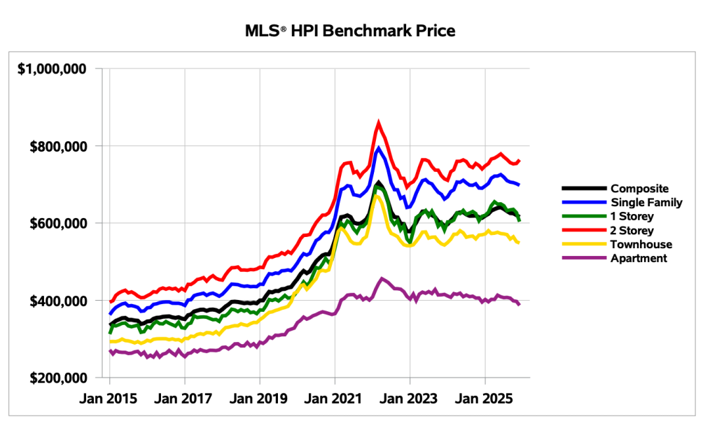 Townhomes continue to adjust as inventory levels remain slightly elevated. Sales activity has been more resilient than in the apartment segment, though pricing pressure is becoming more apparent. The townhouse benchmark price declined 3.7% year over year, the average sale price fell just 1.4%. This gap suggests that softness has been more pronounced at the benchmark level than in actual transactions. Sales mix and sustained interest from first-time buyers, who continue to view townhomes as a more accessible entry point, have helped support average and median prices.